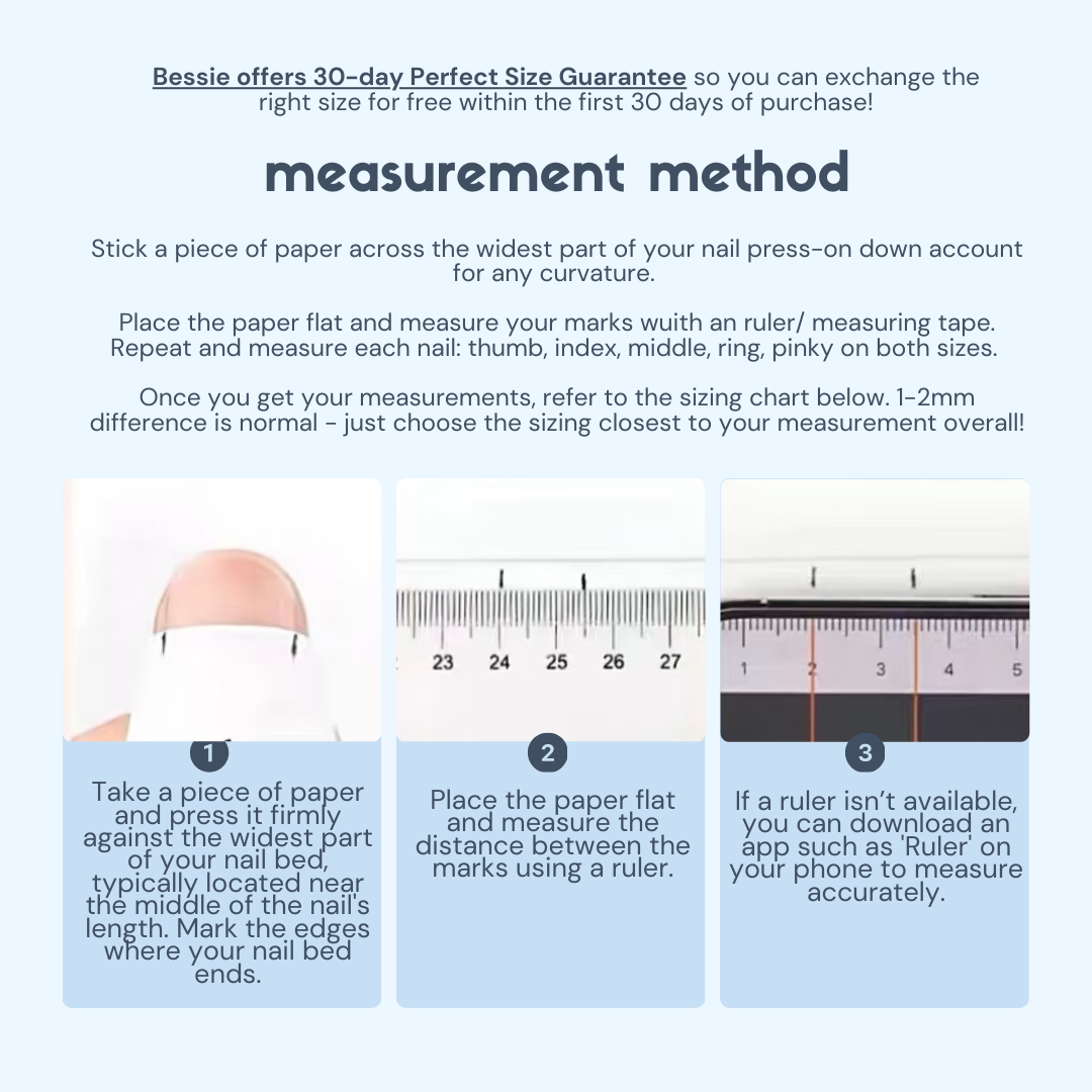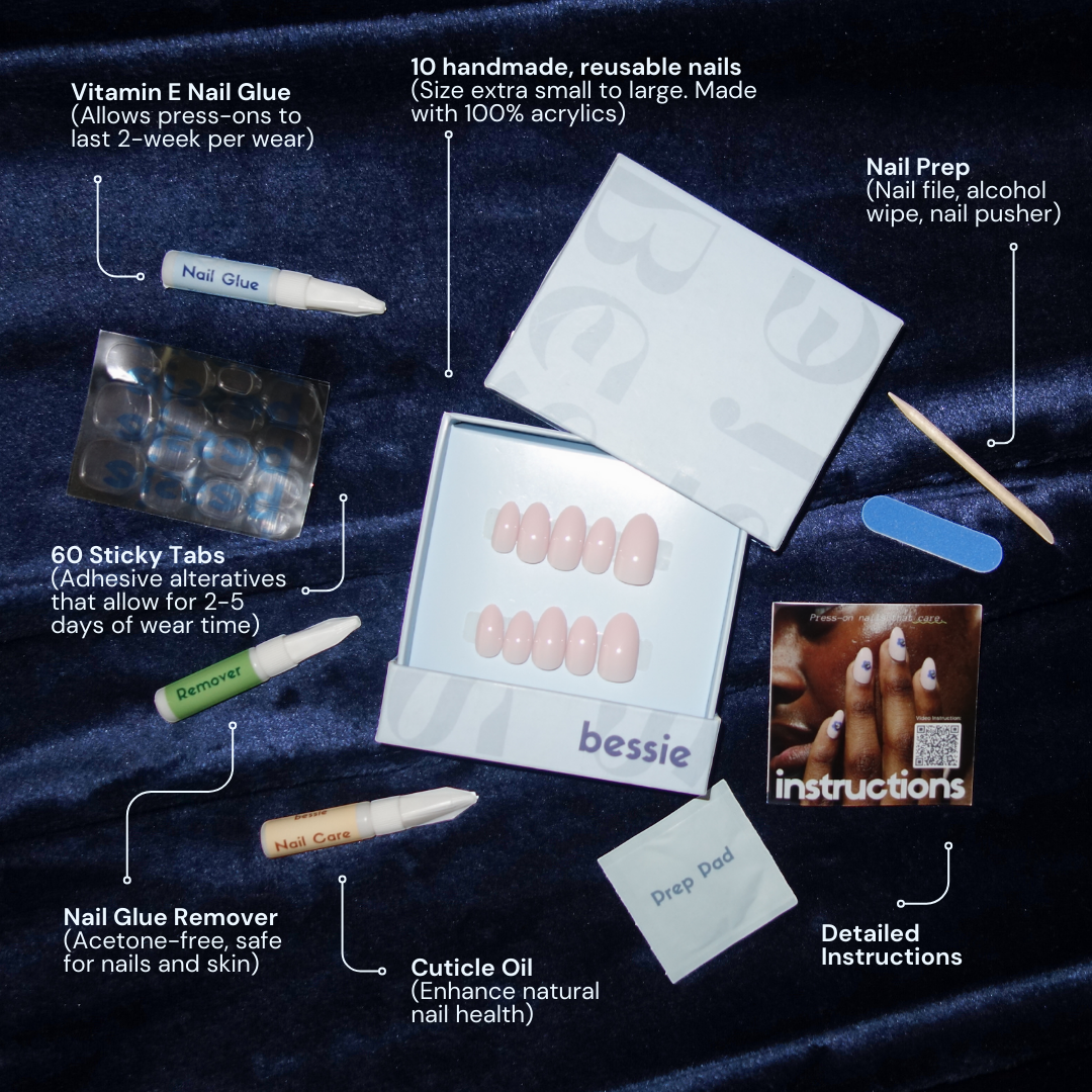 With Bessie premium quality press-ons, you'll express yourself fully without sacrificing nail health